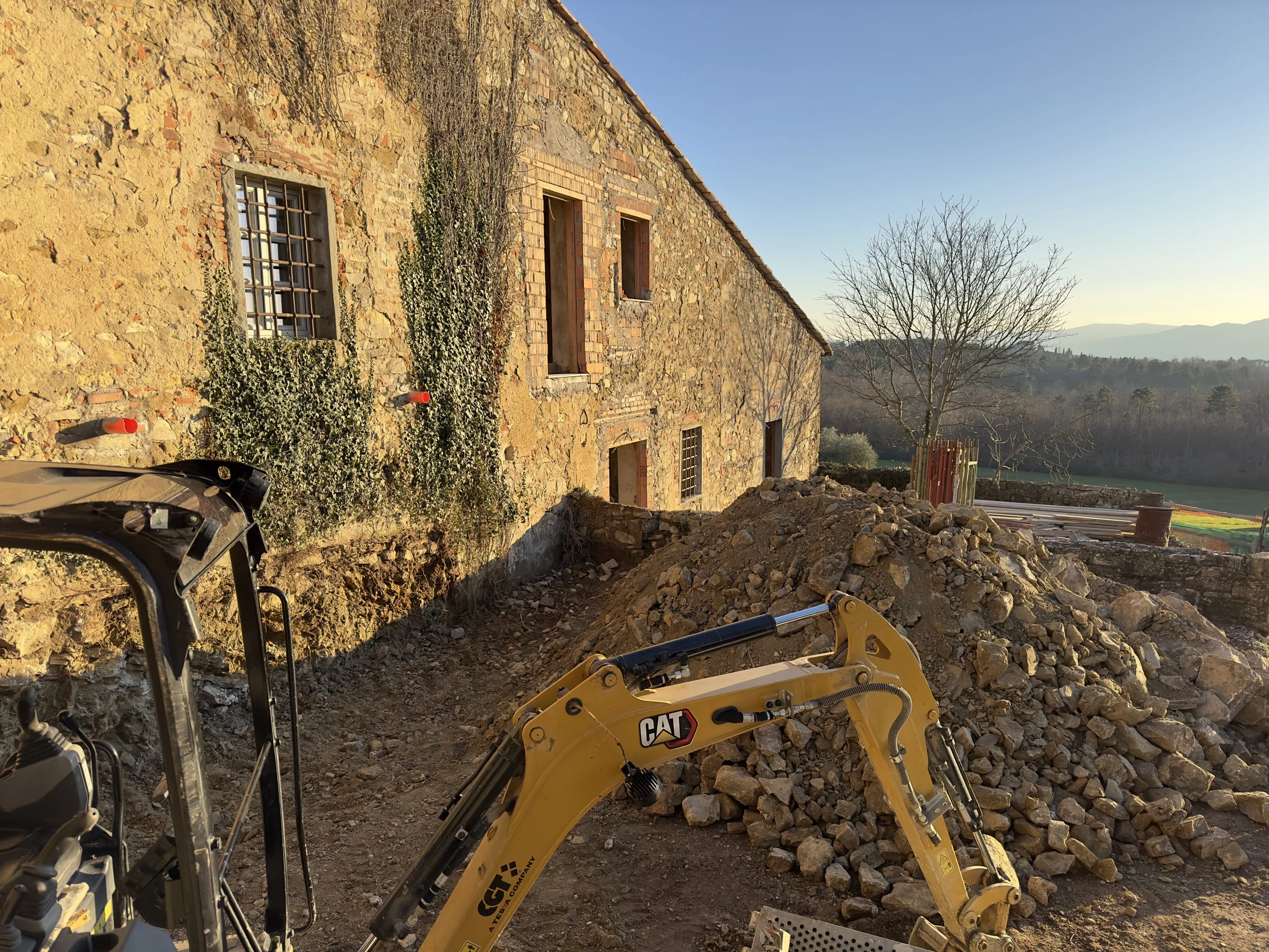 Costruzione o ristrutturazione di una struttura in un'area rurale, con una vecchia struttura in pietra e attrezzature da costruzione, inclusa una mini escavatrice gialla, in un paesaggio naturale al tramonto.