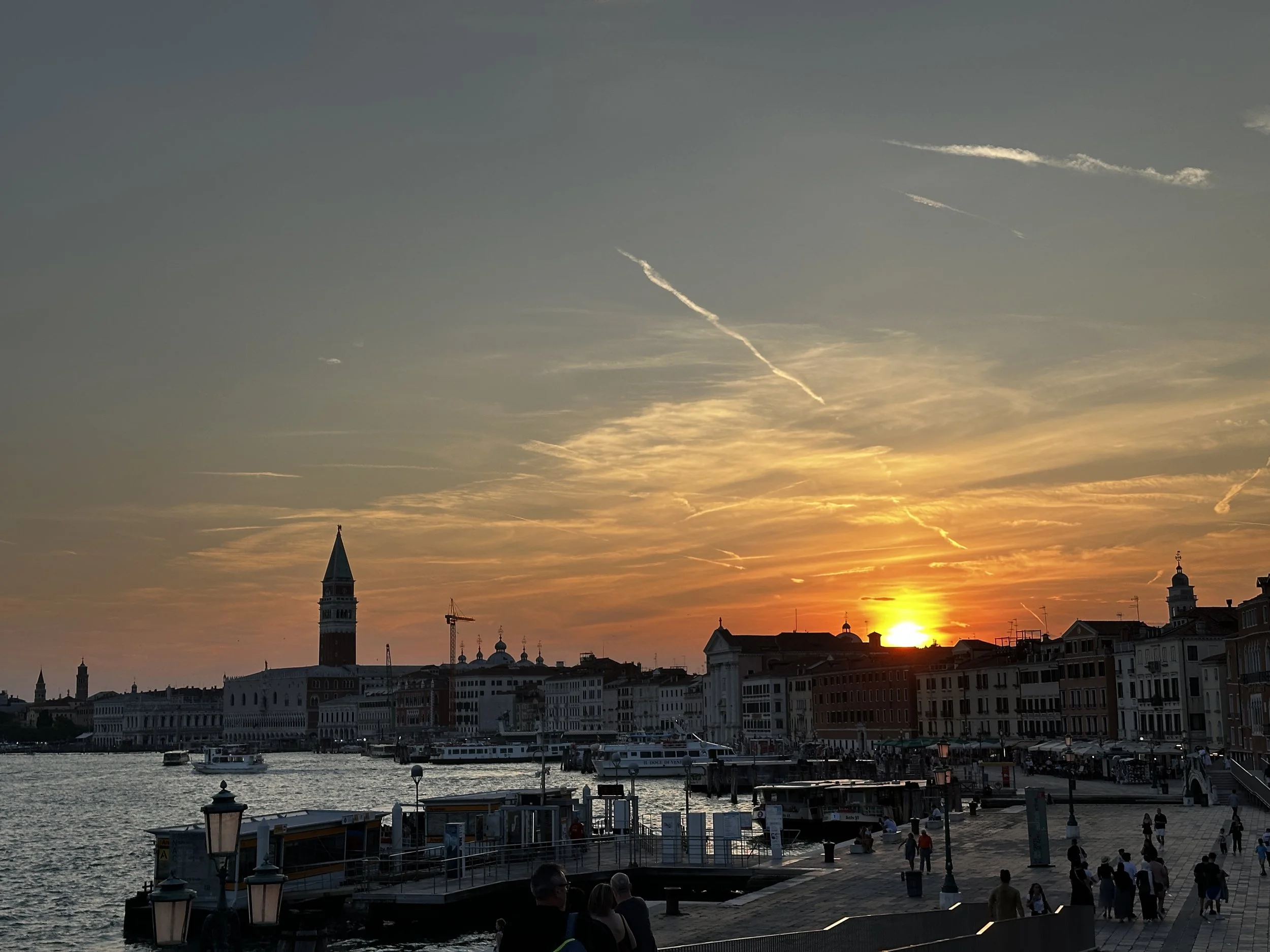 Scorcio del tramonto a Venezia con il leone di San Marco sul campanile e barche sul canale